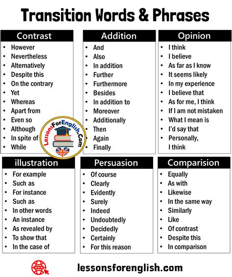 - For Comparison: Use words like similarly, likewise, in the same way, equally, and by the same token.